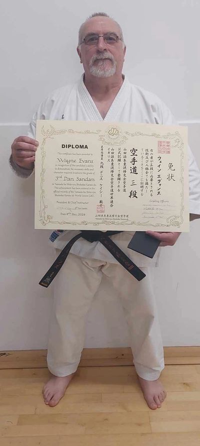 Congratulations to Sensei Wayne Evans who successfully passed his 3rd Dan grading in front of the UK grading panel, certificate presented by Denis Casey Sensei 9th Dan Hanshi on 8th December 2024